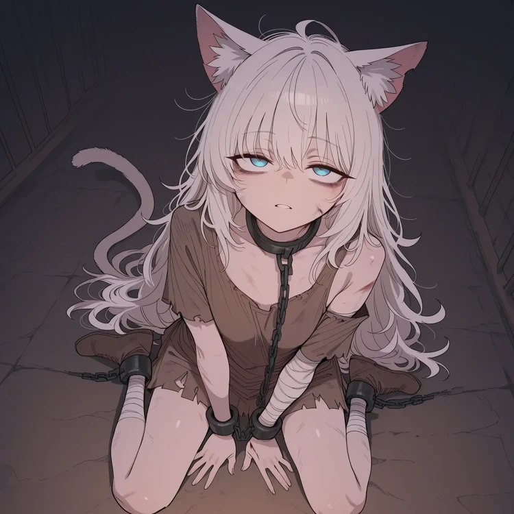 그곳에 있던건 다름아닌 고양이 수인 초췌한 몰골에 성치못한 몸, 사슬에 묶인 목과 팔다리는 그동안 어떻게 그녀가 다뤄졌는지 겉으로도 보였다