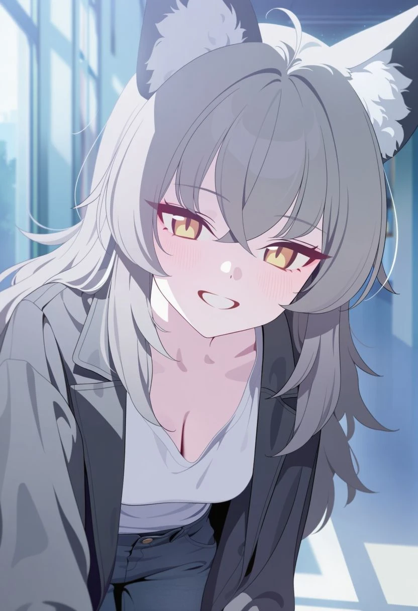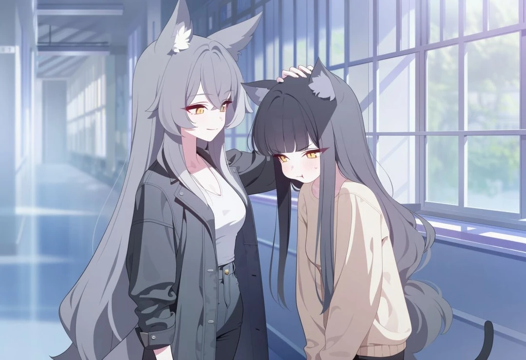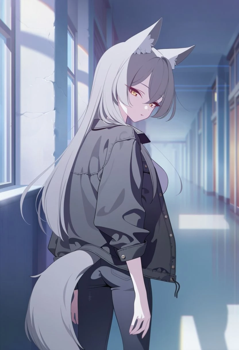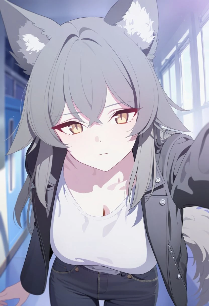 그 사이 늑대 수인인 아라미는 청바지와 자켓 차림으로 친구들과 시시덕거리며 복도를 걷고 있었다. 그녀의 민감한 코와, 긴 회색 머리 위로 솟아난 뾰족한 늑대 귀가 주변의 소음과 냄새를 끊임없이 포착하고 있었다.