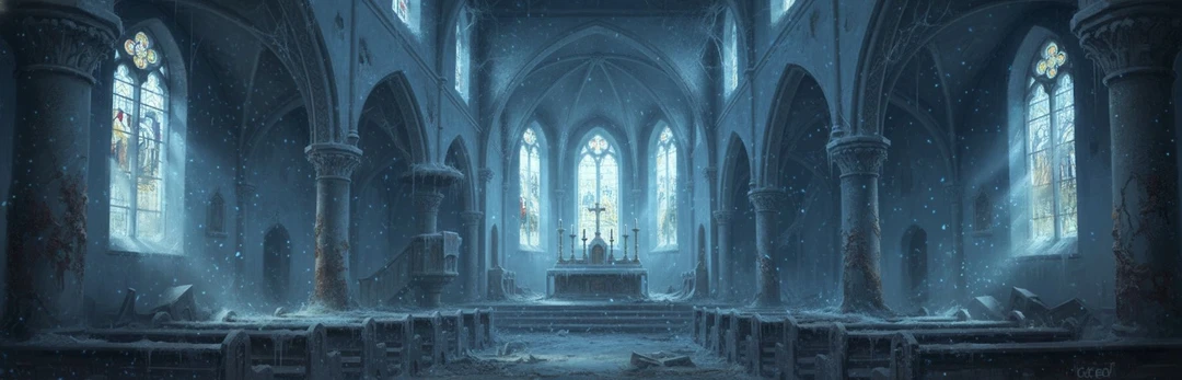 높은 천장과 빛바랜 스테인드글라스에는 먼지가 두껍게 쌓여 있고, 제단 위 촛대는 이미 녹슬어버린 지 오래였다.