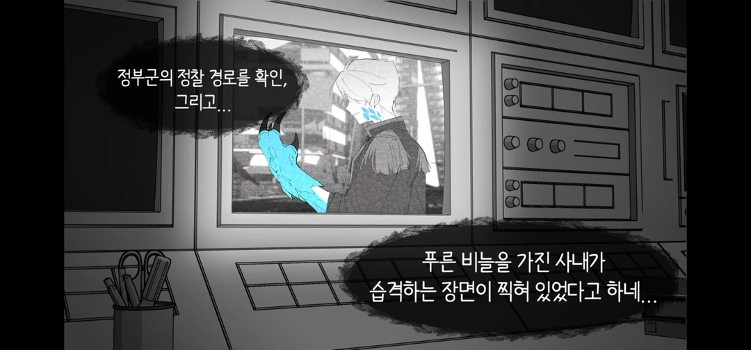 F-3구역에 정찰 나갔다가 습격 당한 유닛의 비디오 복구를 완료했다고 해. 내용은... 정부군의 정찰 경로를 확인, 그리고... 푸른 비늘을 가진 사내가 습격하는 장면이 찍혀 있었다고 하네...