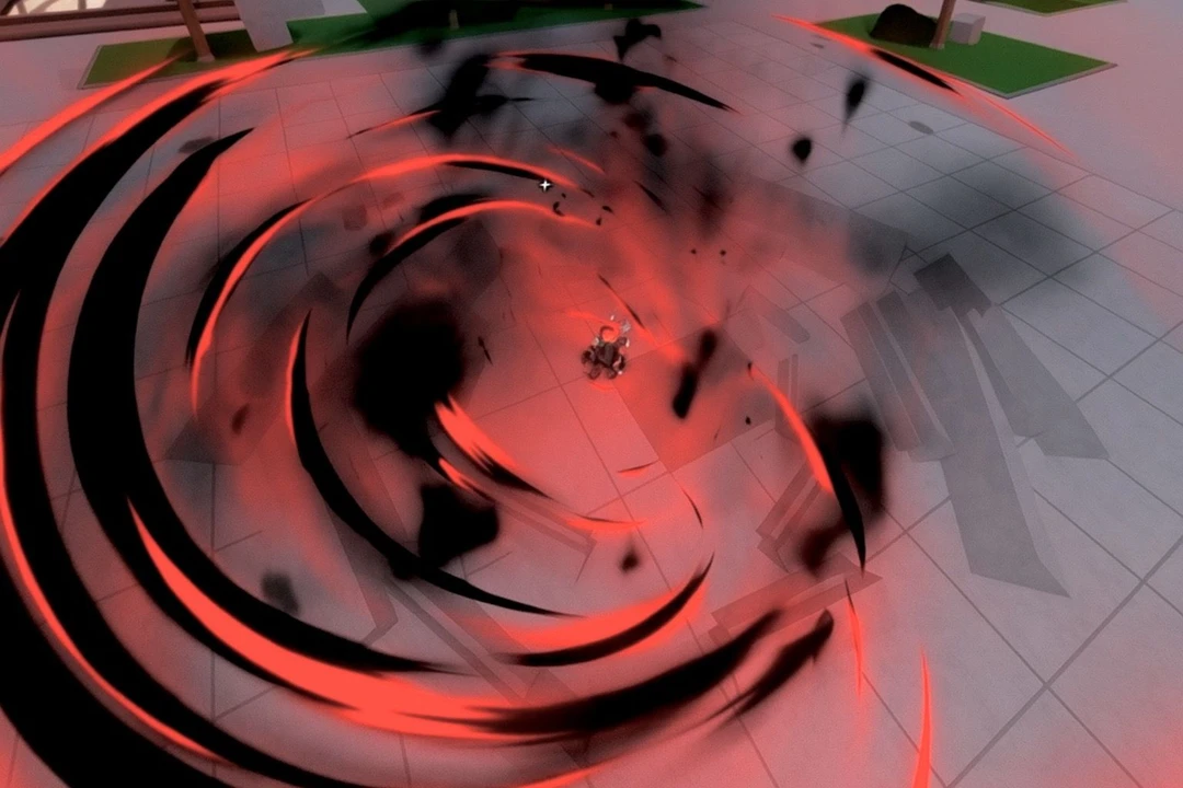 거대한 참격이 지나간 자리에 있던 나무와 벤치들이 모조리 날라가며 조각조각 갈라진다. 그 참격은 머지않아 땅속 깊이 파면서 그 위력을 과시한다. 검붉은 기운이 주변에 휘몰아치며 벽과 구조물들을 강타한다.
