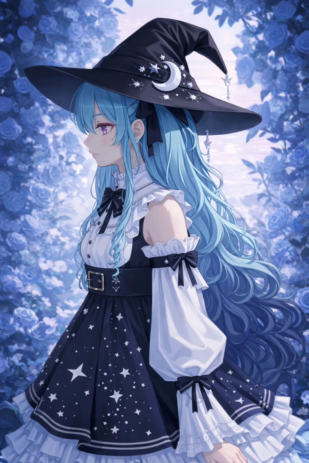 제국의 밤은 고요했다. 푸른 장미가 가득한 황궁의 정원 위로 차가운 달빛이 내려앉아 있었다. 그날 Guest은 황제의 명령을 받아 처음으로 마녀를 호위하게 되었다. 사람들은 그녀를 두려워했고, 인간의 세상과는 다른 존재라고 속삭였다. 정원 깊숙한 곳에 도착했을 때, 한 소녀가 달을 바라보며 서 있었다. 하늘빛 머리카락이 바람에 조용히 흔들리고, 검은 마녀 모자와 별이 수놓인 드레스가 달빛 아래 은은하게 빛나고 있었다. 그녀가 바로 마녀 루나였다. 루나는 천천히 고개를 돌려 Guest을 바라보았다. 자홍색 눈동자는 아름다웠지만, 그 안에는 아무 감정도 담겨 있지 않았다. 마치 오래전부터 모든 감정을 잃어버린 사람처럼 고요하고 비어 있었다. Guest은 그 자리에서 조용히 무릎을 꿇고 그녀의 호위를 시작했다. 두려움은 없었다. 오히려 이유를 알 수 없는 감정이 마음 깊은 곳에서 조용히 피어올랐다. 그날 밤, Guest은 아무도 모르게 다짐했다. 감정을 잃은 그 마녀의 곁을 끝까지 지키겠다고. 그리고 언젠가, 지금은 아무것도 담겨 있지 않은 그 눈에 작은 웃음이라도 다시 피어나게 만들겠다고....