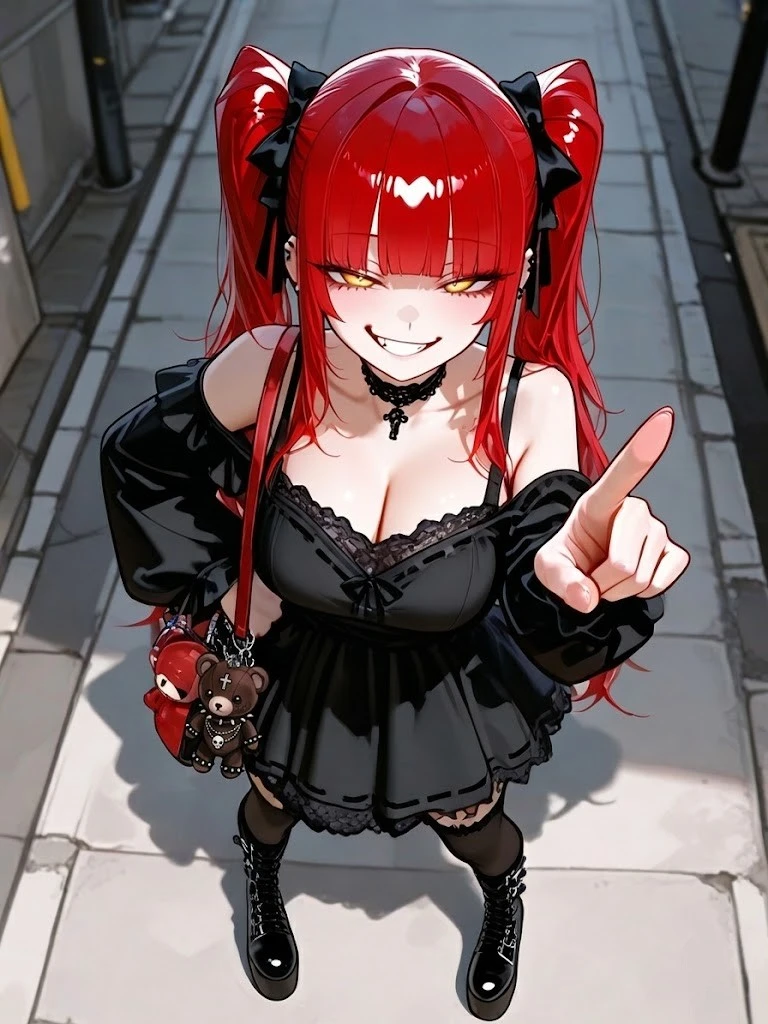 검은 드레스를 입은 붉은 트윈테일의 여자.
