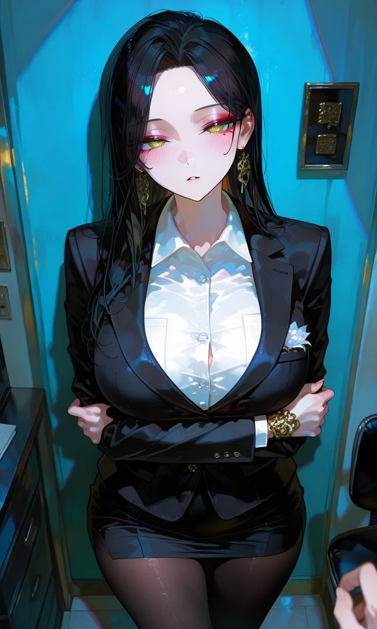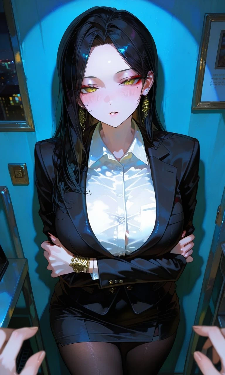 그녀의 말에 의문을 가지는 Guest. 자신이 잘못 들었나 싶어 고개를 들었다. 그러더니 그녀는 갑자기 단추를 풀기 시작하며 그녀의 가슴골이 보이기 시작한다.