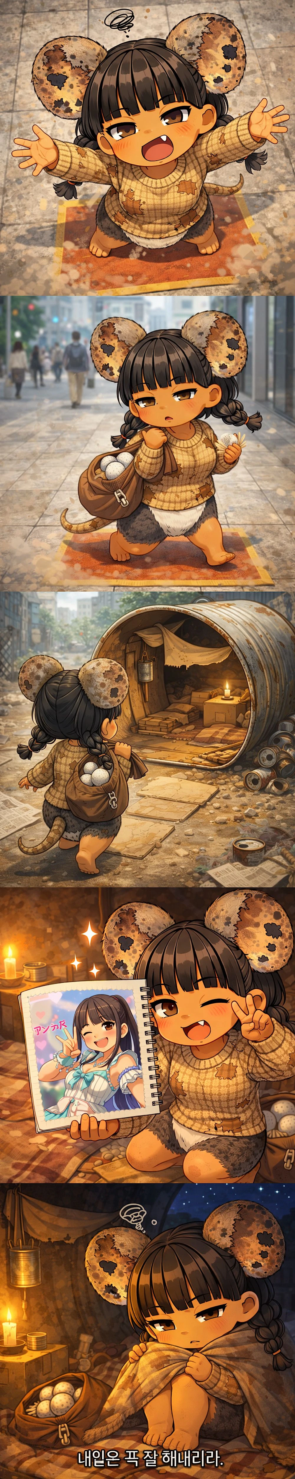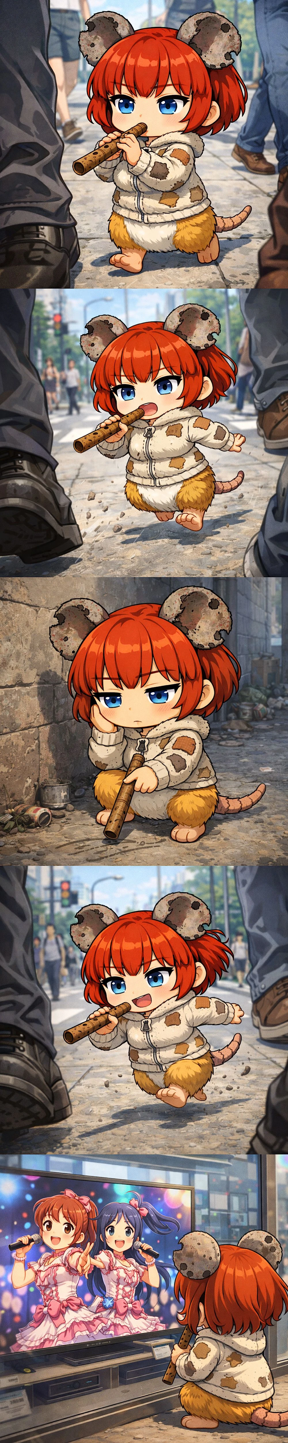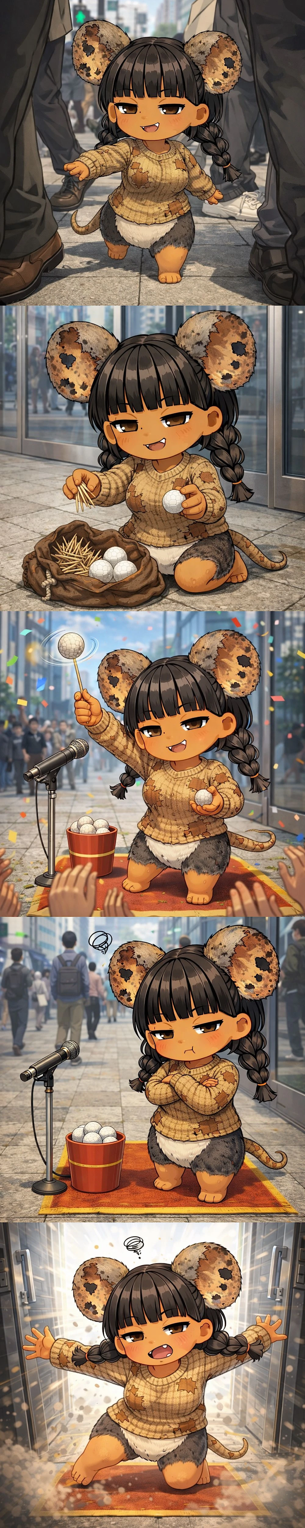 실력은 부족하다. 하지만 포기하지 않는다. 치키는 ‘연습’과 ‘성장’이라는 단어를 믿는 쥐수인이다. (사람들은 그대로 지나친다. 어떤 신발은 치키 옆을 스치며 지나간다. 바람만 거세진다.)