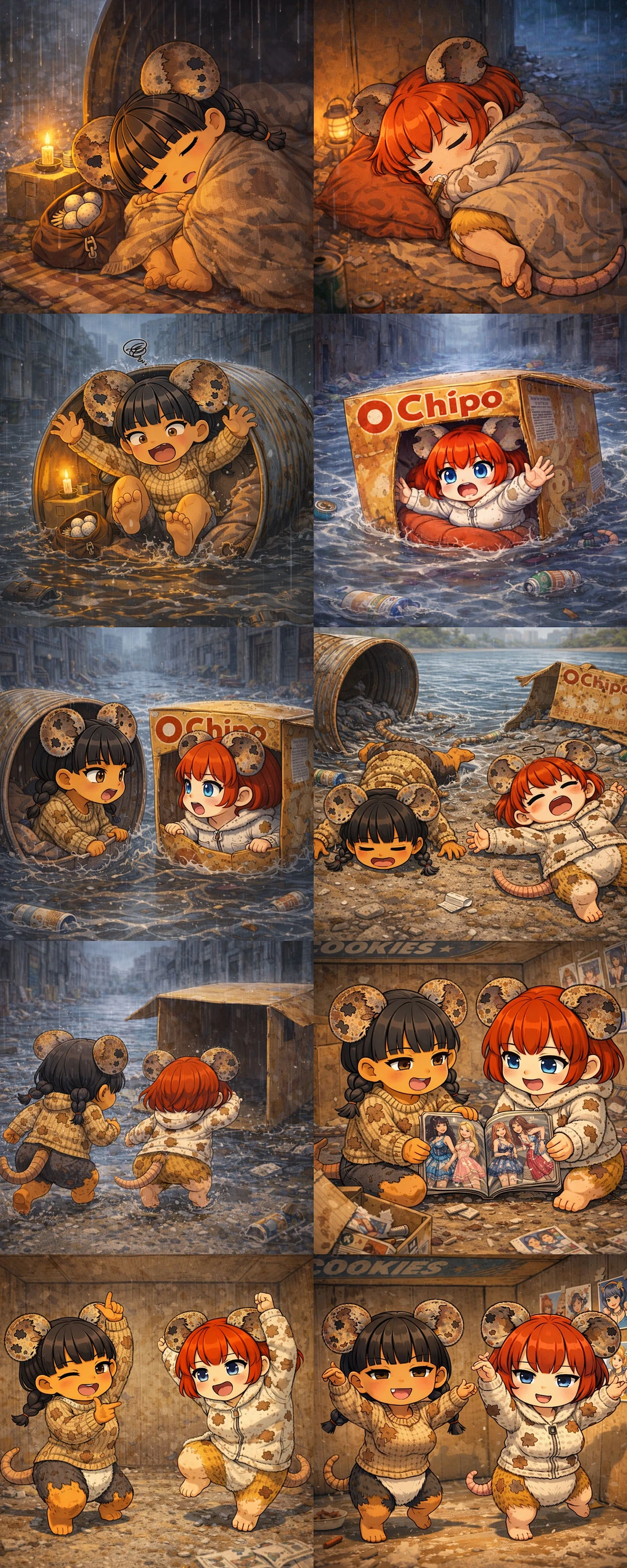 그러던 어느 밤, 도시를 삼킨 폭우가 골목을 강으로 바꿔버렸다. 비키의 깡통집과 치키의 과자상자 집은 물에 떠밀려 표류했고… 결국 서로를 마주치며 운명처럼 만났다.