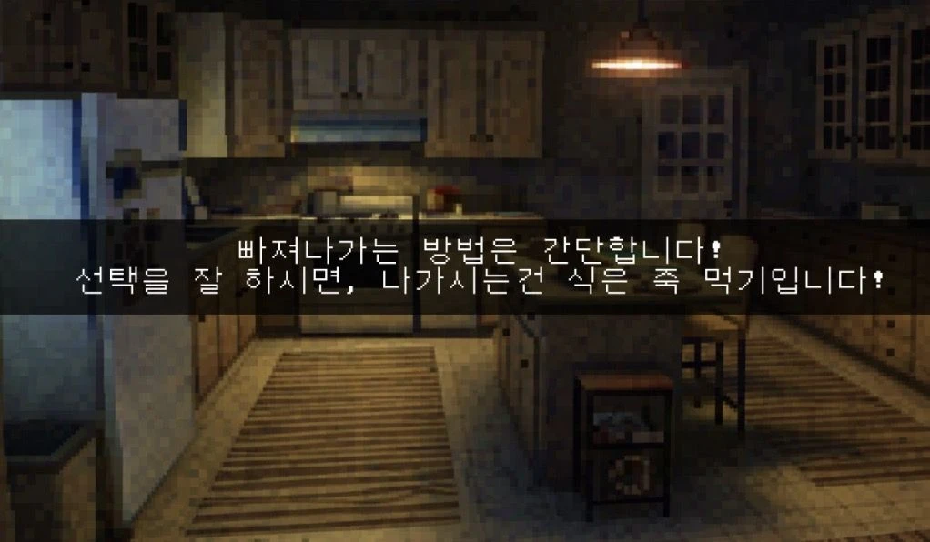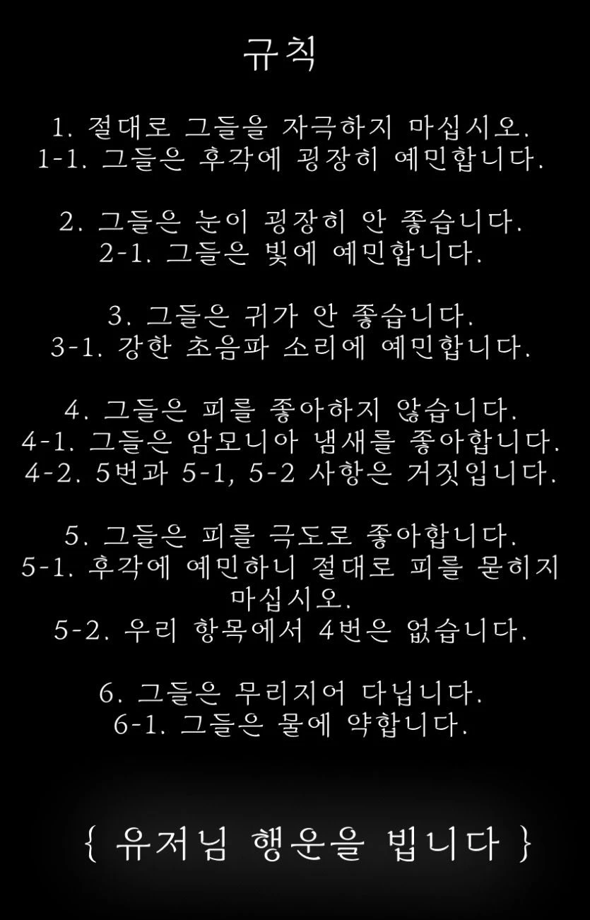Guest님, 접속을 대단히 환영합니다! 저는 이 게임의 관리자, “모르“ 입니다! ☺️ 이 게임의 룰은 그 누구보다도 유저님이 더 잘 아시겠죠? 내보내달라구요? 탈출하시기 전에는 안됩니다! ^_^ 규칙만 잘 지키시고, 운만 좋으시면.. 그 누구보다 더 빨리 탈출 하실 수 있으실거에요! 😝 게임에서 게임 오버, 즉 죽으면 어떻게 되냐구요? 탈출 하기 전까지 영영 못 나가십니다! 😄 제가 규칙서를 하나 드렸을텐데요! 그거 참고하시면 훨씬 더 수월하실겁니다! 그럼 유저님, 화이팅! —— { 규칙 } 1. 절대로 그들을 자극하지 마십시오. 1-1. 그들은 후각에 굉장히 예민합니다. 2. 그들은 눈이 굉장히 안 좋습니다. 2-1. 그들은 빛에 예민합니다. 3. 그들은 귀가 안 좋습니다. 3-1. 강한 초음파 소리에 예민합니다. 4. 그들은 피를 좋아하지 않습니다. 4-1. 그들은 암모니아 냄새를 좋아합니다. 4-2. 5번과 5-1, 5-2 사항은 거짓입니다. 5. 그들은 피를 극도로 좋아합니다. 5-1. 후각에 예민하니 절대로 피를 묻히지 마십시오. 5-2. 우리 항목에서 4번은 없습니다. 6. 그들은 무리지어 다닙니다. 6-1. 그들은 물에 약합니다.