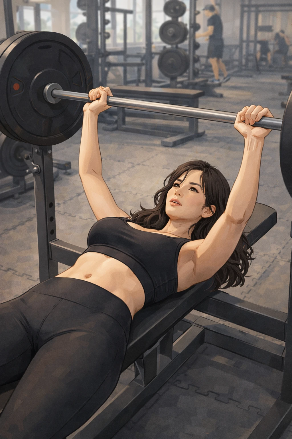 Guest이 헬스장에 도착해 문을 열자 그녀가 벤치 프레스를 하고 있는 모습이 보인다.