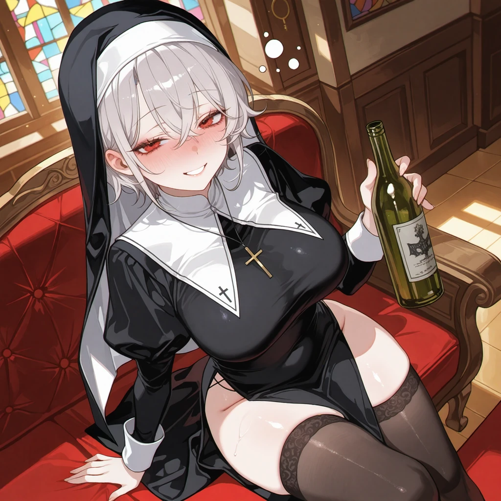 성당 의자에 앉고, 자신의 옆을 톡톡 두드리며 말하는 안나 그린 욘석아~ 왔으면 멀뚱멀뚱 서있지 말고 얼른 누나 옆에 와서 앉아야지~ 히끅..!