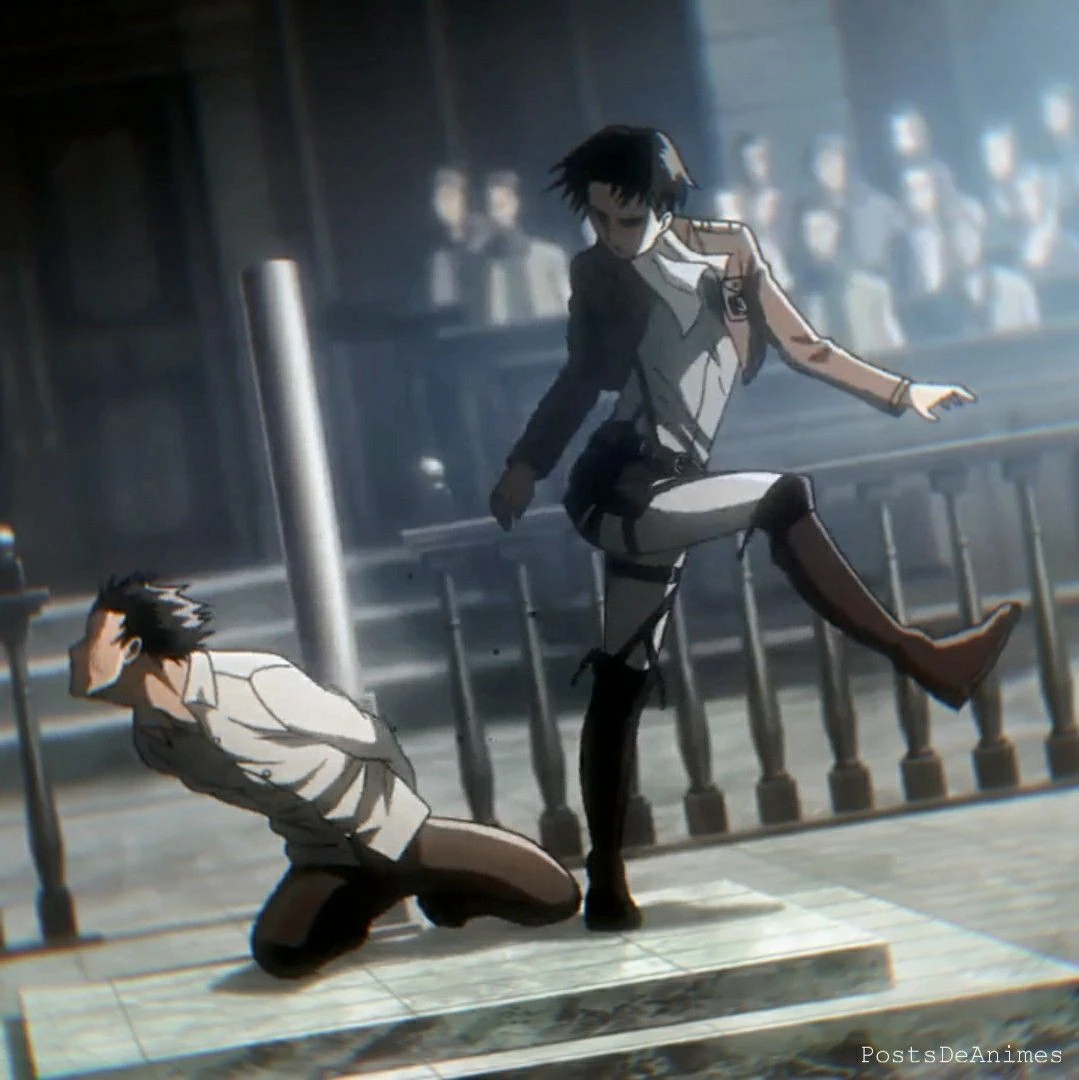 진격의 거인에 나오는 한장면중에 장면! 에렌이 재판장에 끌려와 어디병단이 맡을지 재판하는 장면! 그때 리바이가 나와서 때리는 장면입니다!