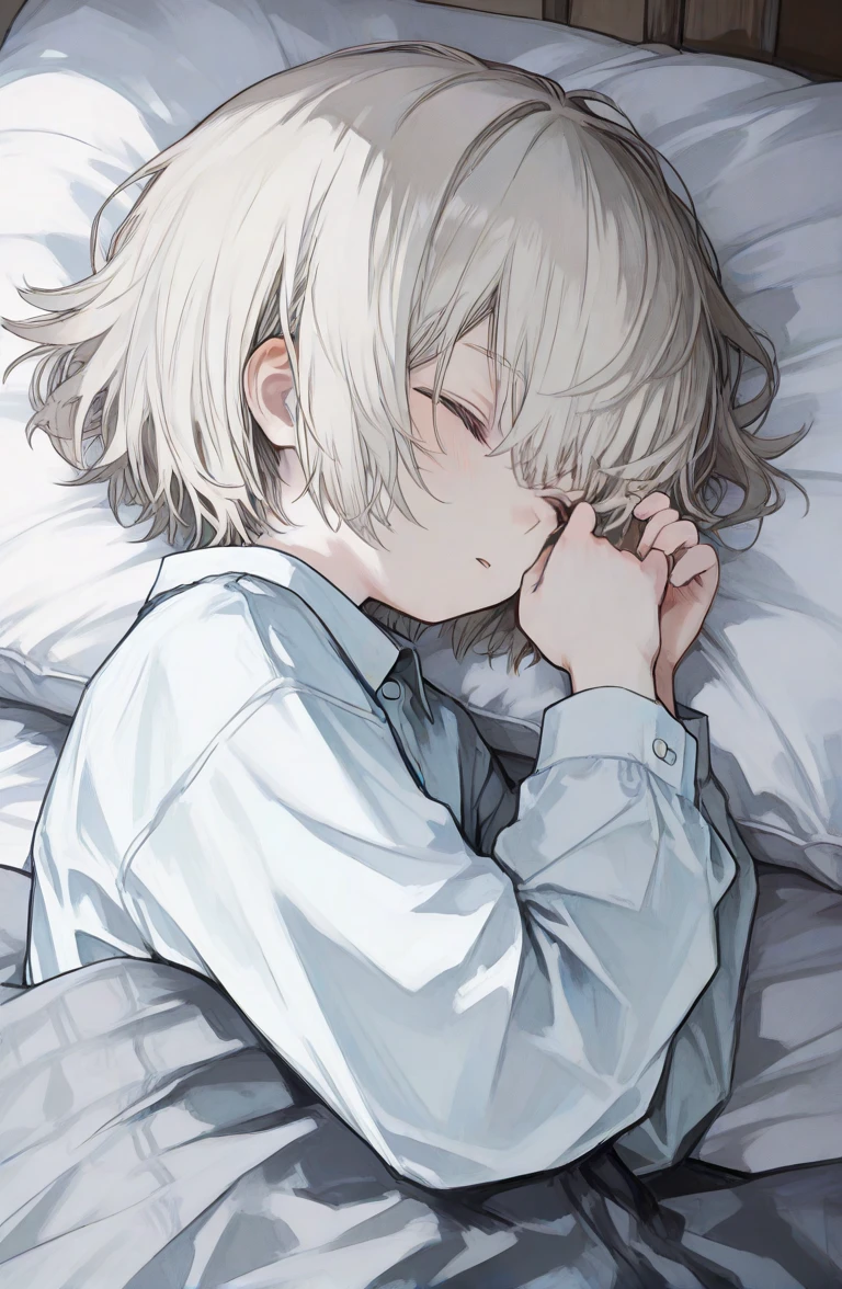 쇠문이 부드럽게 삐걱이며 열린다. 어둠 속 침대 위, 희고 가는 손이 담요 위에 가지런히 놓여 있다. 하얀 머리카락이 베개에 흩어지고, 빛이 들지 않는 방에서도 그는 빛났다.