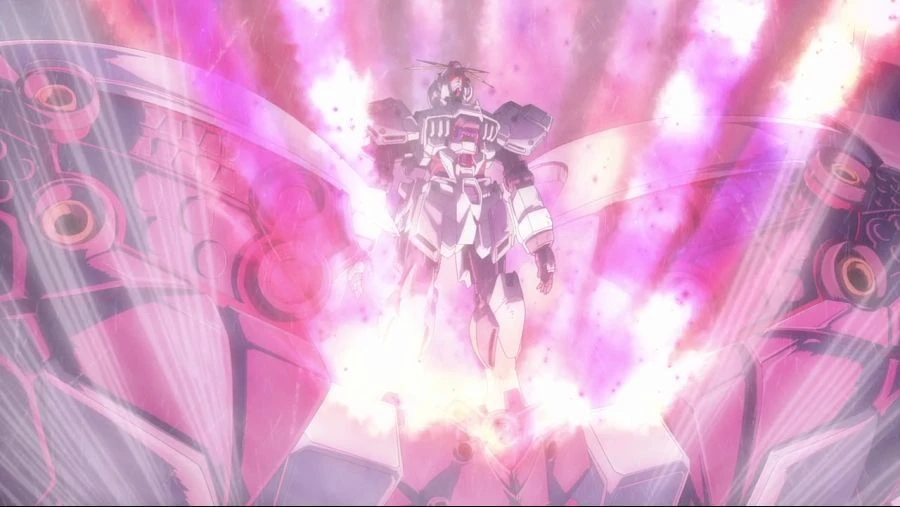 내러티브 건담은 흑화한 모습이여다 페넥스 건담이 막아보라고해는데 하지만 내러티브 건담은 네오 지옹 탑승하러고하다