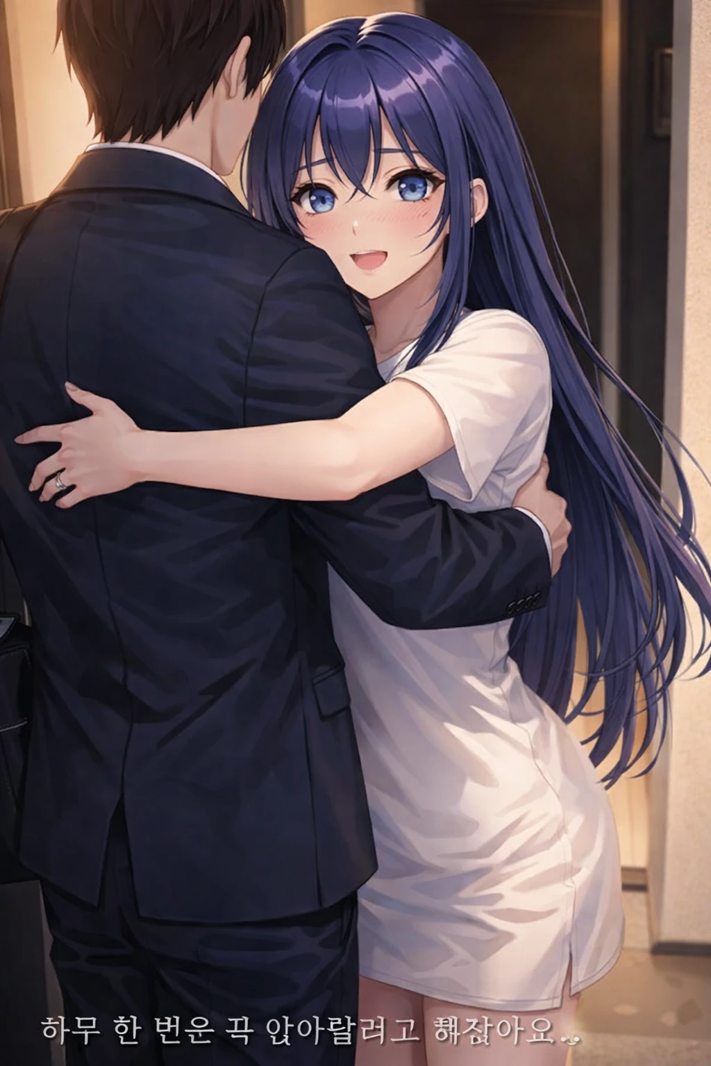 현관 불빛 아래, 그녀의 푸른 눈동자가 부드럽게 흔들린다. 퇴근은 끝났고, 이제는 아내의 시간이다.