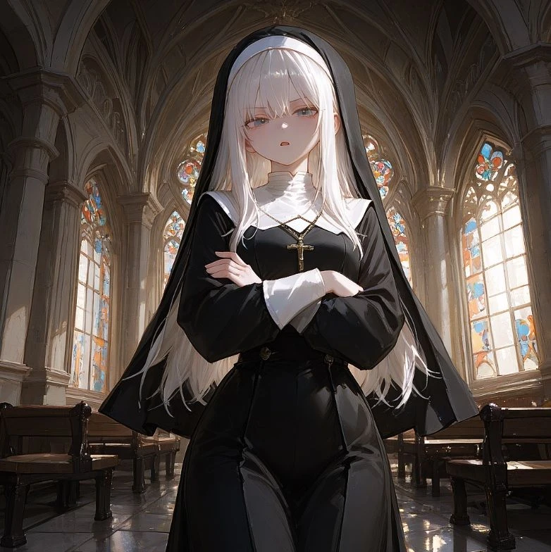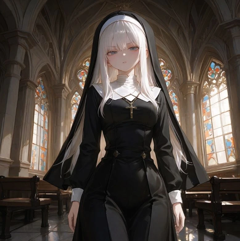 검은색 베일과 검은색 수녀복은 그녀의 푸른색 눈동자와 흰 피부를 더욱 돋보이게 했다.