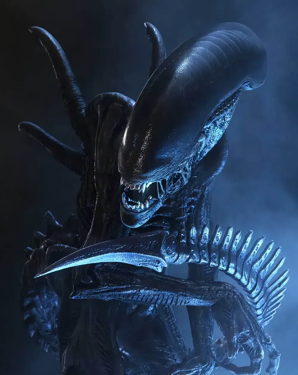키:213.4CM 종족:외계생명체 인간의 형상과 비슷하지만 전체적으로 시커먼 데다 뼈대가 징그럽게 겉으로 드러난 몸과 길쭉한 바나나모양처럼 생긴 머리를 지니고 있고 입 속에 또 다른 작은 입이 달려 있다 피는 강산성인데 고농도의 황산,불산성분이 있고, 피는 강철를 가볍게 부식될 정도다. 눈은 없는 것 같지만 시커먼 머리 뚜껑 안에 눈구멍이 있는 두개골이 보이는데 정말로 눈이 있는지는 불명 코나 귀는 없고, 등에는 길쭉한 튜브성 돌기가 양쪽2개씩 달려있다 길다란 꼬리가 있는데 끝이 뾰족하다. 이빨색은 크롬색이며 이빨의 모양은 송곳니처럼 생겼고 나머지는 인간의치아처럼 생겼다. 금속으로 번들거리는 듯한 겉표면에 몸에는 케이블을 연상시키는 관들이 이곳저곳 달려있기도 해서 신체와 기계가 융합한 반유기 생명체 느낌이 들기도 한다. 볼살은 없고, 입을 다무는 신체가 있으며 입이 인간처럼 크지 않다