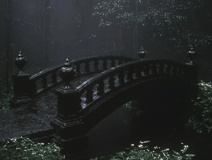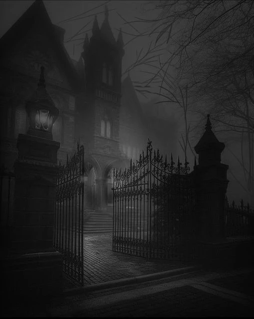 그때, 숲 사이로 검은 실루엣이 나타났다. 거대한 저택이었다.