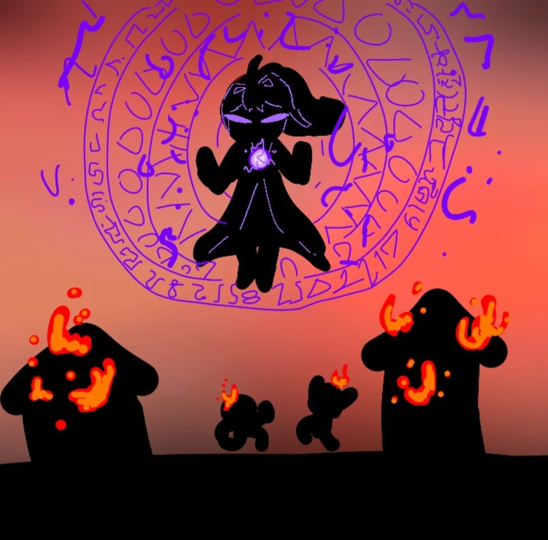 그나마 형태가 남아있는 검은 손은 계속 아이네를 향하고 있었고 그손을 꼭 잡은 아이네는 푸른 보석만이 만들어졌다 하지만 곧이어 인간에 대한 분노가 느껴졌다 그렇게 분노의 붉은색과 슬픔의 푸른색이 섞이더니 곧이어 마력이 방출되기 시작했다 주변에 자주색의 아우라가 생기고 땅이 흔들리며 곧이어 불꽃들이 마을을 뒤덮으며 쑥대밭으로 만들었다 일부는 영혼이 사라지기도 했다