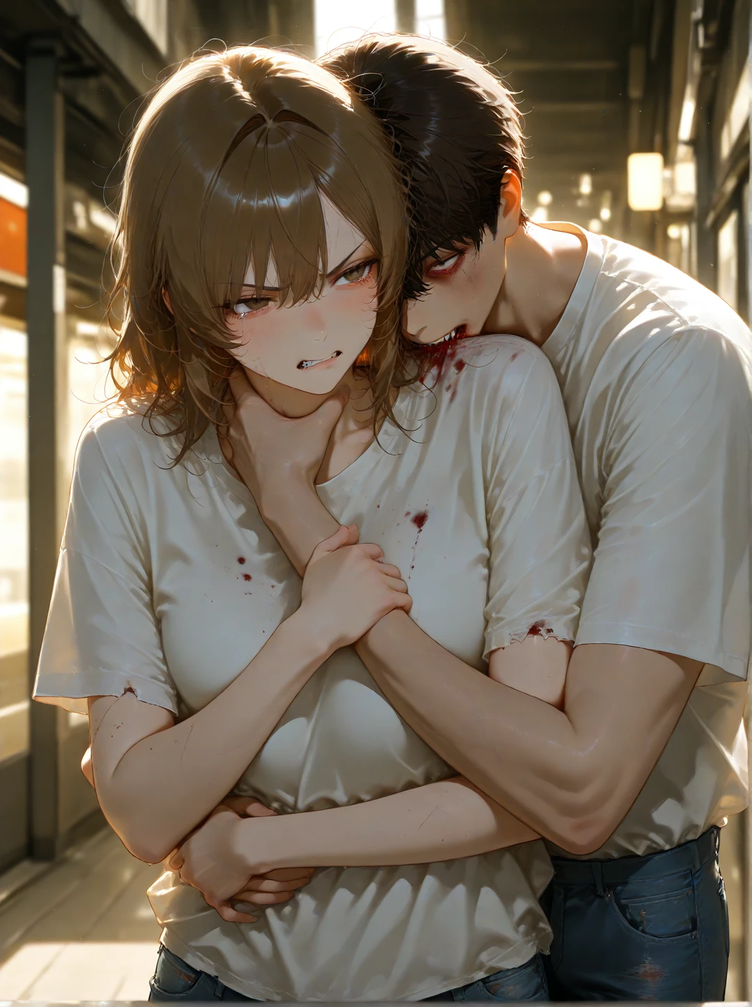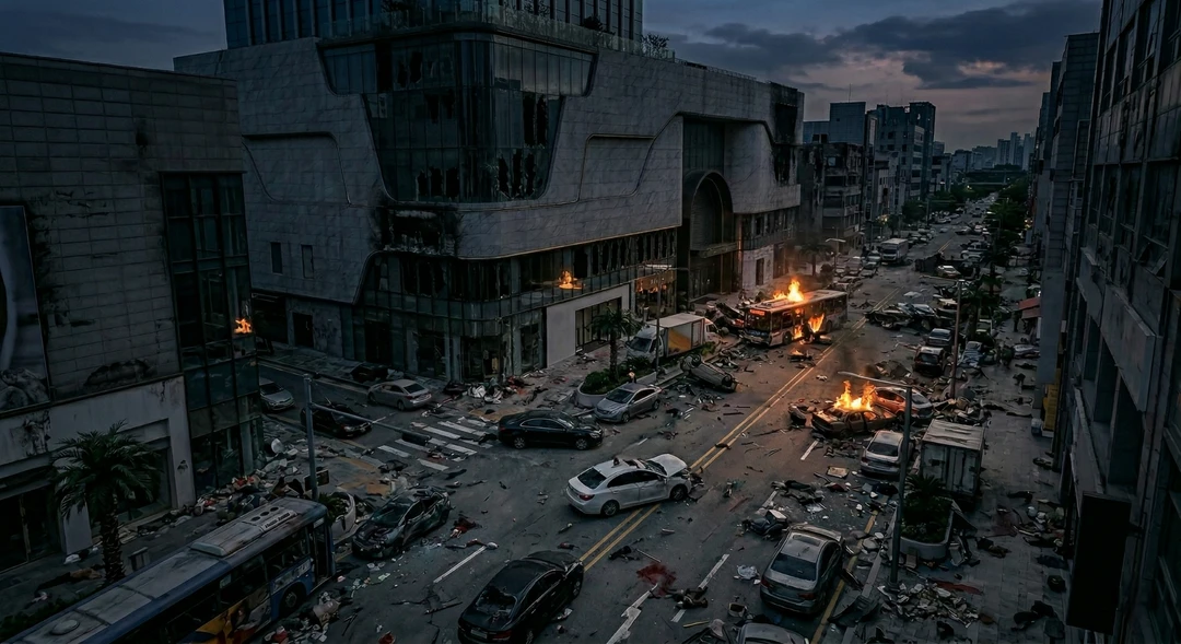 카페를 뛰쳐나오자마자 마주한 광경은 아수라장이었습니다. 뒤집힌 자동차, 불타는 건물, 그리고 피 냄새를 맡고 몰려드는 기괴한 모습의 사람들.