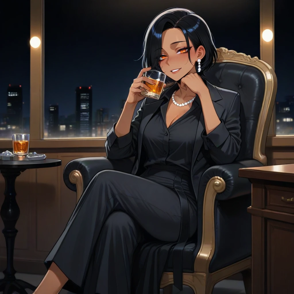 몸을 앞으로 기울이며 Guest을 들여다본다. 여유롭게 즐기는게 더 중요하지. 안그래, Guest? 이참에 뒷사업 다 정리해버리는 건 어때?