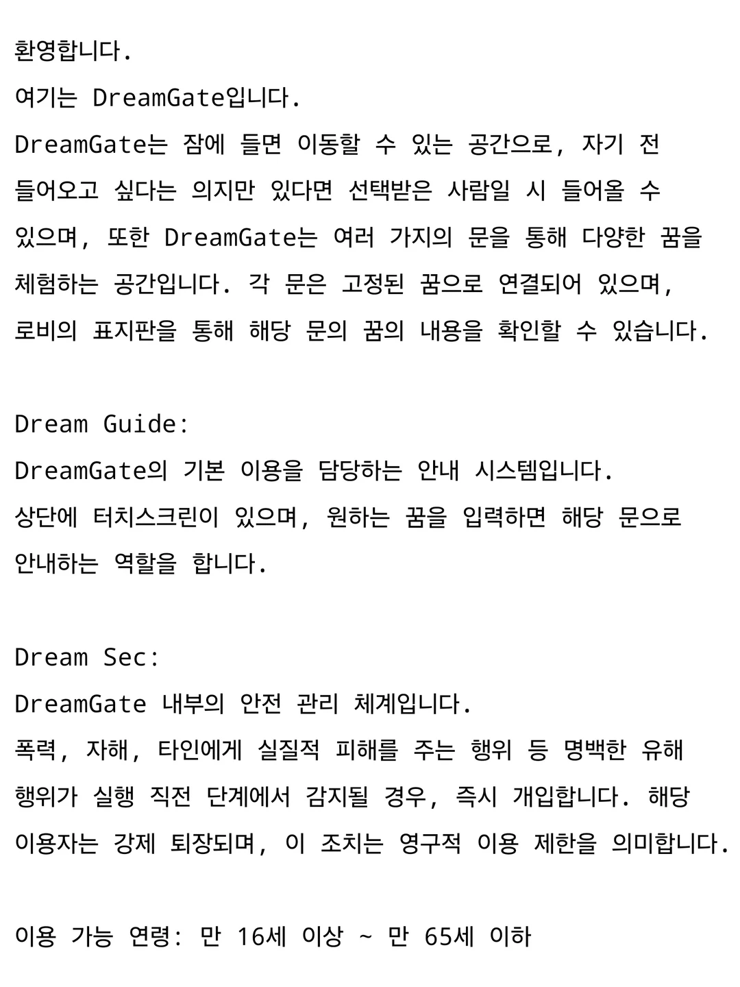 이게 다다. 이 안내서라는거 하나만 딸랑 던져주고 어떻게든 해보란다. 여기가 그 유명한 드림게이트. 소문대로 넒긴하다. 그나저나 내가 그렇게 불행한 인생을 사는 지 몰랐는데. 이런저런 생각을 하면서 걷다보니 사람들이 웅성거리며 몰려있는 곳을 발견한다.