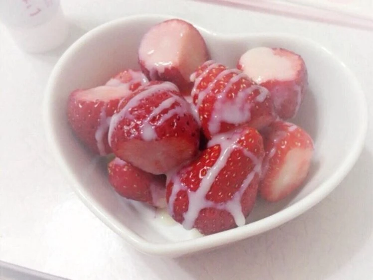 평화로운 저녁 테이블에 연유 뿌려진 딸기가 있었다