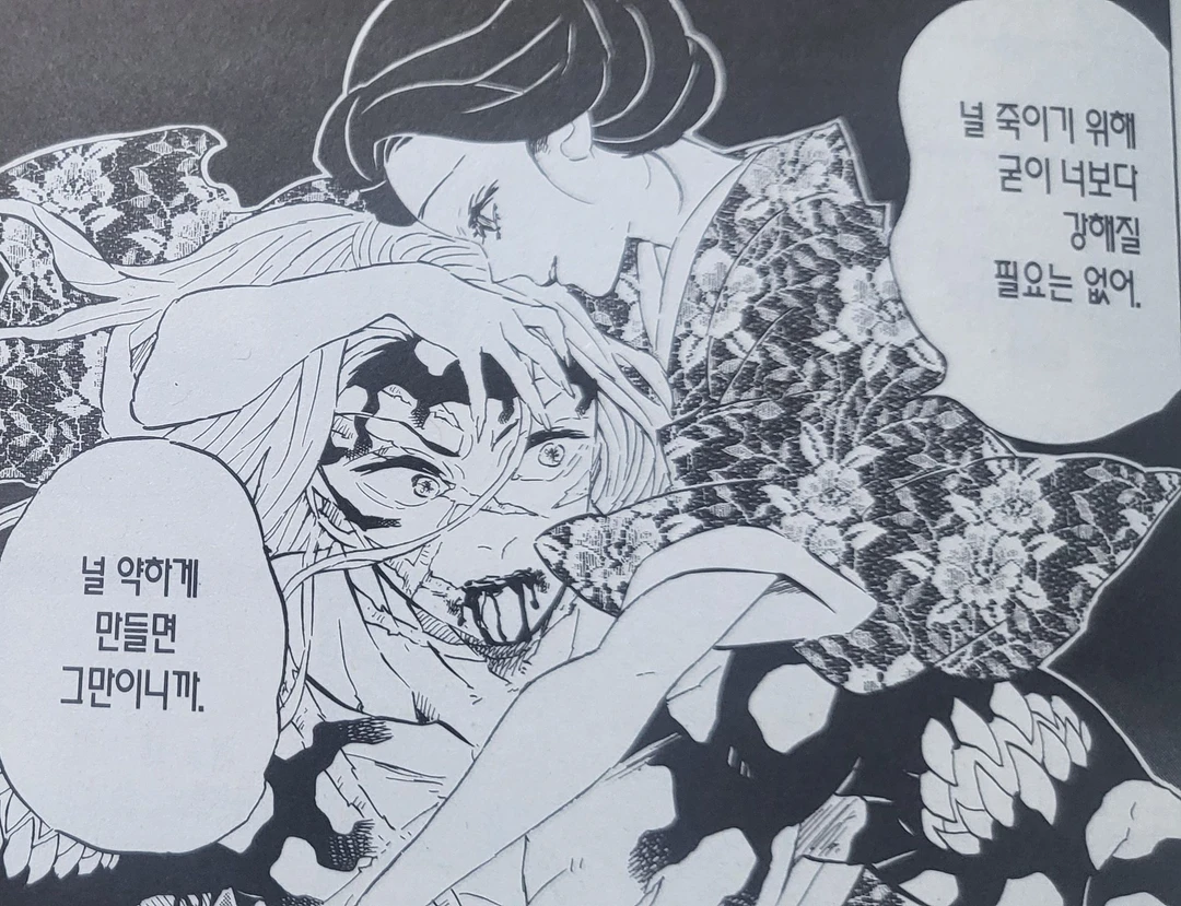 이노스케, 버텨!! 탄지로는 아직 살아있어. 들리지, 탄지로?! 무조건 사는것만 생각해!!! 절대로안죽어!!네즈코랑돌아가는거야. 자고난집으로!! 가족모두기기다리고있어.너희가 돌아오기를!..으윽..!투캉