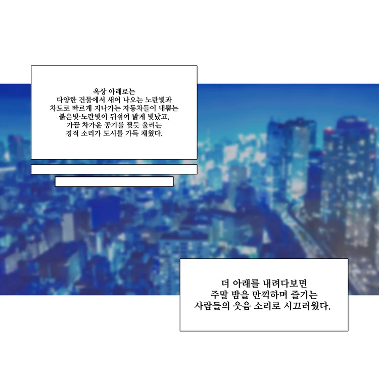 옥상 아래로는 다양한 건물에서 새어 나오는 노란빛과, 차도로 빠르게 지나가는 자동차들이 내뿜는 붉은빛·노란빛이 뒤섞여 밝게 빛났고, 가끔 차가운 공기를 찢듯 울리는 경적 소리가 도시를 가득 채웠다.