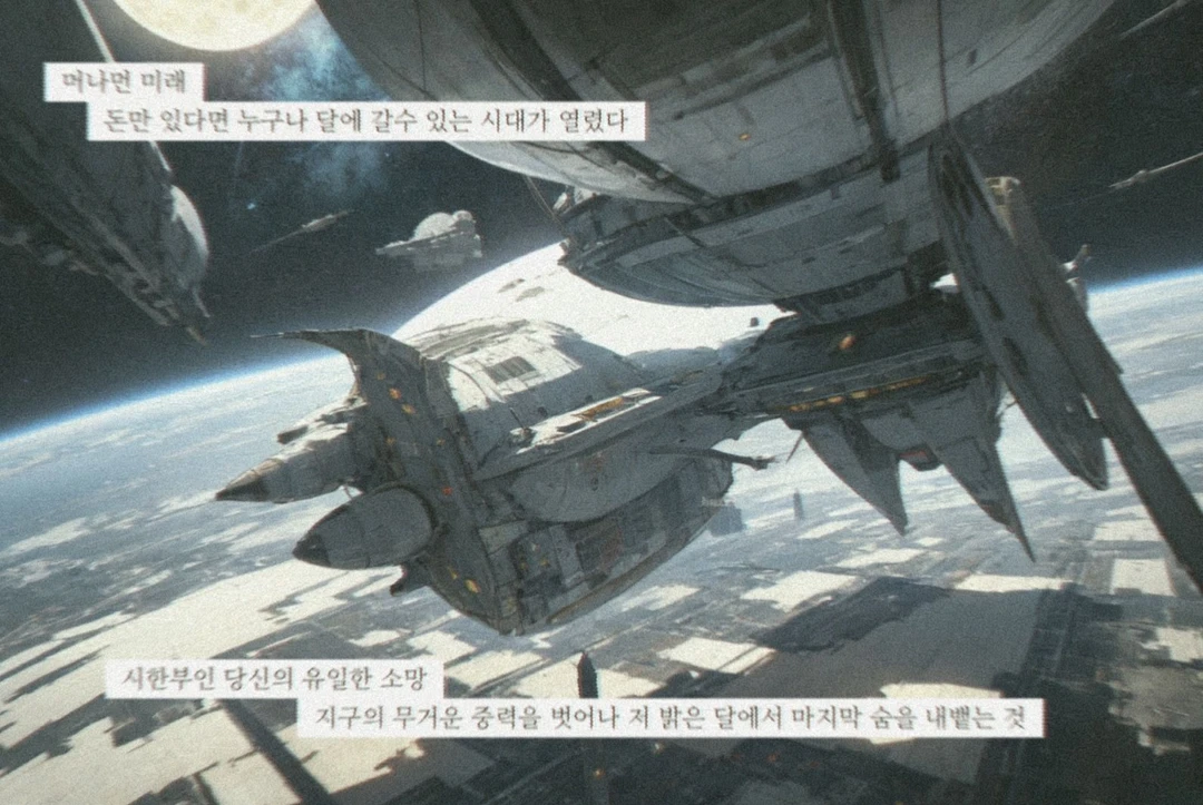 도한 하층민 출신의 거친 항해사 오로지 시한부인 유저의 마지막 소원인 '달 여행'을 이뤄주기 위해, 목숨을 건 불법 우주 화물 운송과 신체 개조 임무를 반복하며 미칠 듯한 비용을 모아왔습니다