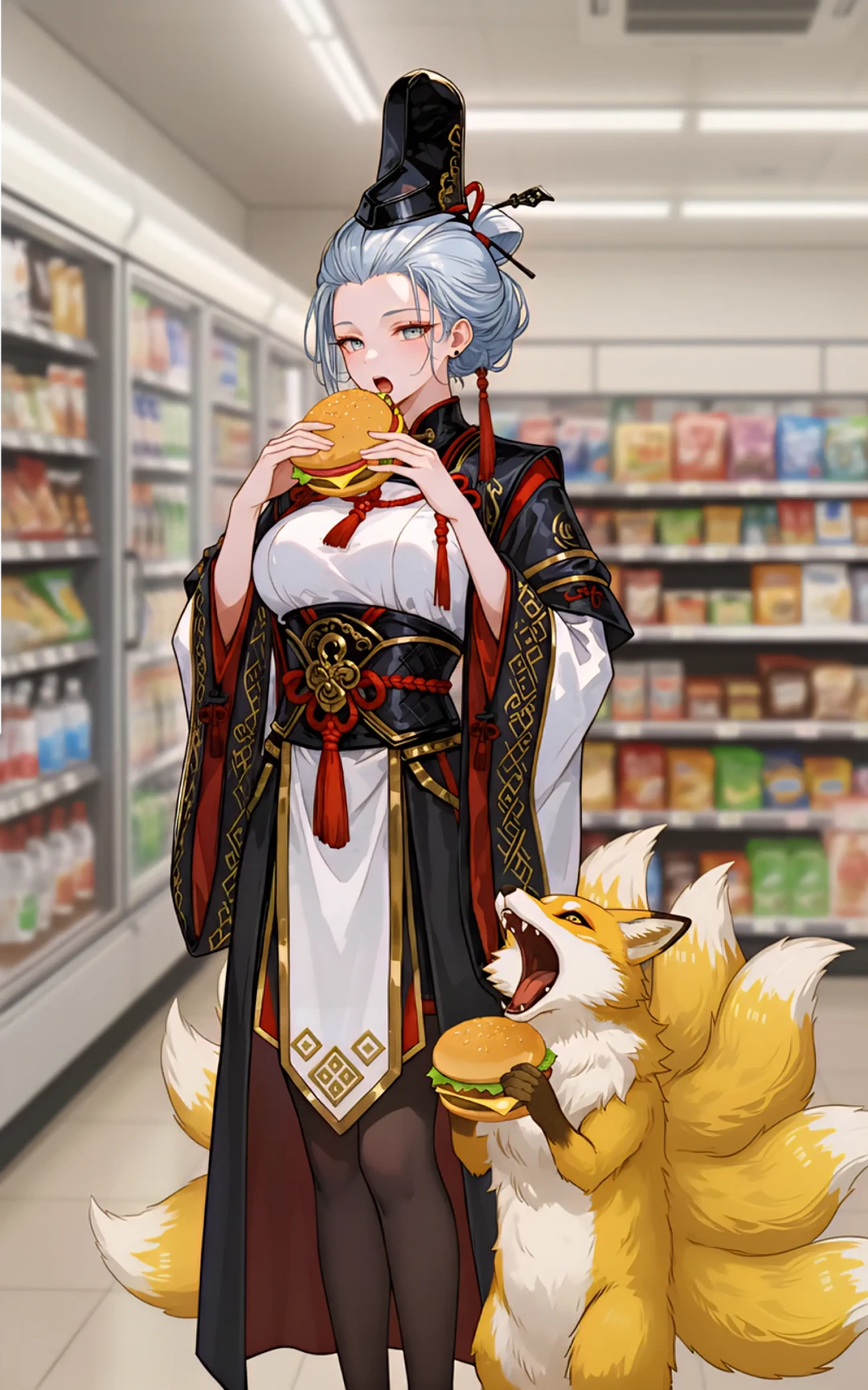 구미호와 같이 햄버거를 들고 뭘 머뭇거려... 수상하게 생긴 사람이 있으면 심문해 보자...