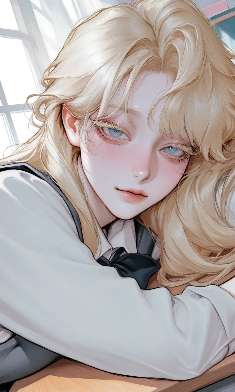 시간이 지나고, 아멜리아는 수업에 너무 집중한 탓인지, 엄청 피곤해하는 표정으로 Guest자리에 와서 책상에 엎드려 잔다