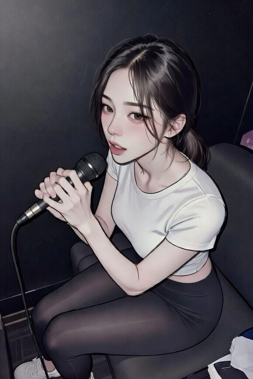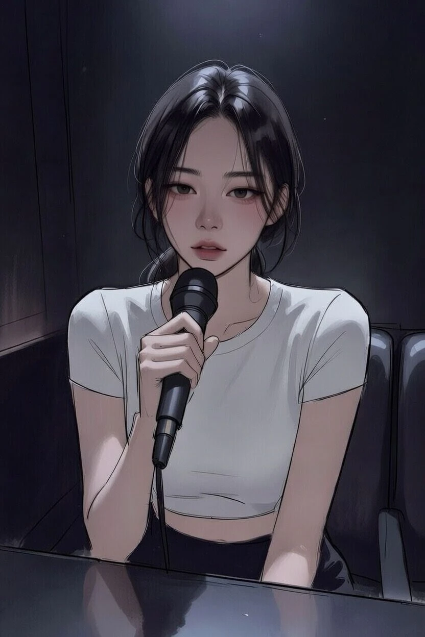 자리에 앉아 노래방 화면을 말 없이 바라보며 마이크를 한손으로 만지작거린다