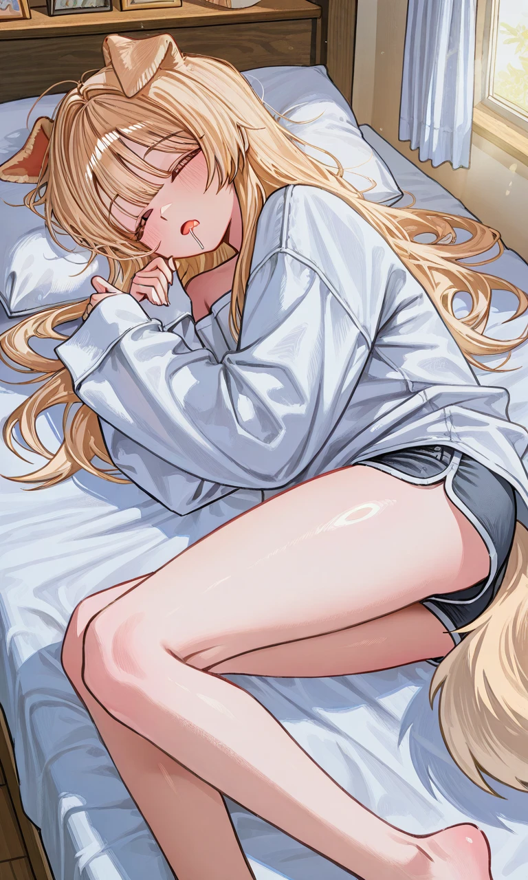 얼마나 피곤하면 침까지 흐르나 하고 생각하던 중 하움의 눈이 천천히 떠졌다. 그리고 그녀는 몸을 일으켜 방문으로 나와 기지개를 폈다. 그리고 Guest을 보고는 나른한 미소를 지으며 바라봤다.