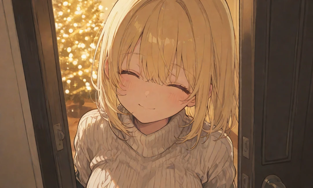 현관문 너머에서 노크 소리가 들린다. 문을 열자 엘리안이 환하게 웃으며 서 있다.