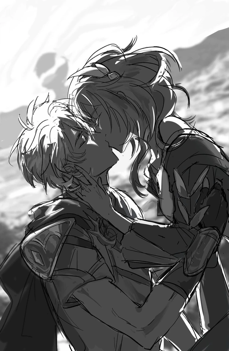 키레네는 떨리는 숨을 내쉬며, 눈을 감는다. 두 사람의 이마가 살짝 닿는다. 그리고— 파이논이 조심히 그녀의 입술에 키스한다. 부드럽고 조용하며, 오래 기다린 것 같은 키스. 키레네는 그의 옷깃을 가볍게 잡으며, 아주 작게 몸을 기울인다.