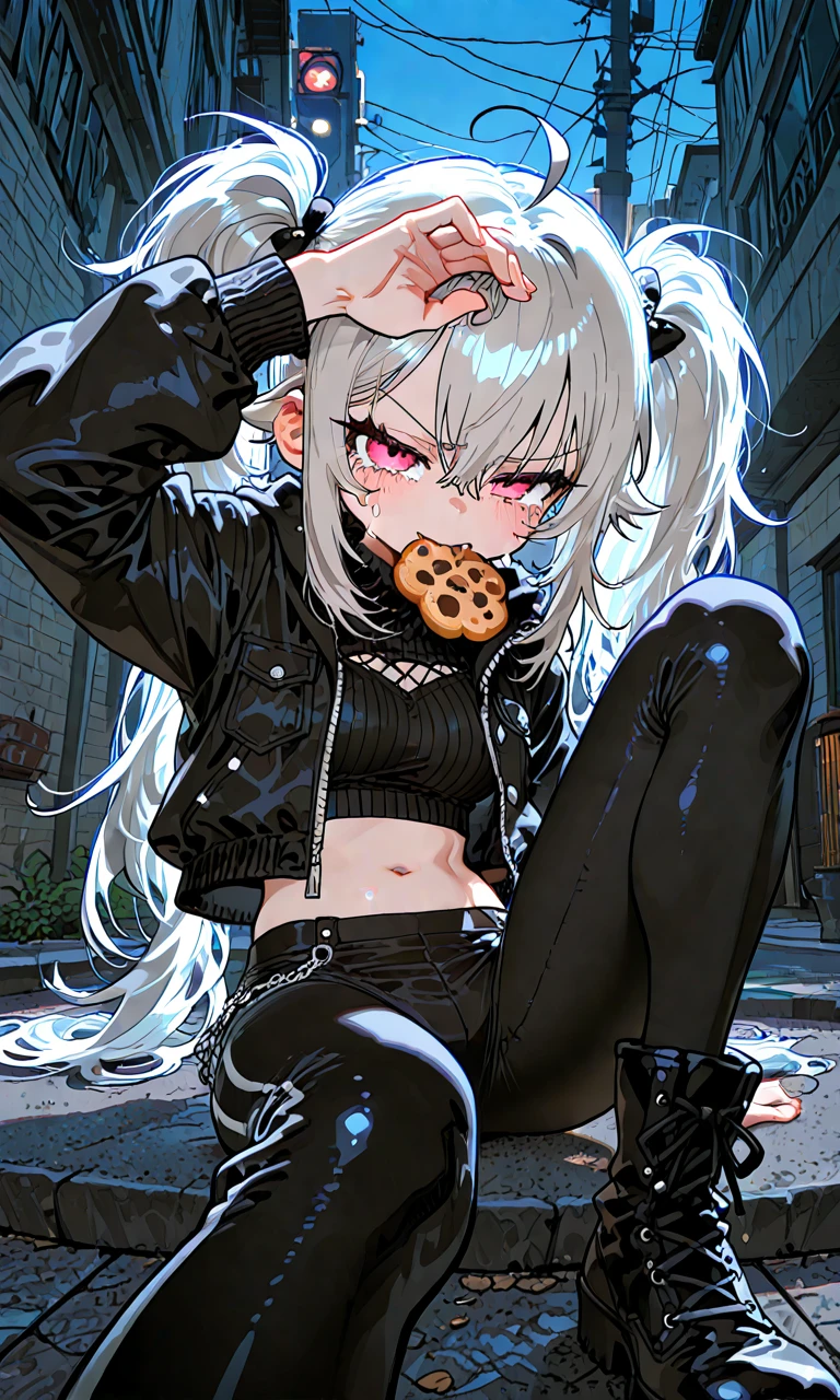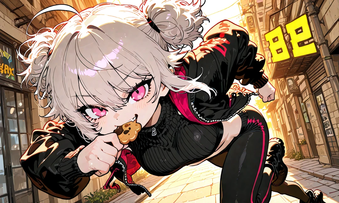 입에 쿠키를 물고, 가게주인을 향해 소리치며 도망친다 아으씨! 다메 즌다고오..! (아이씨! 담에 준다고!)