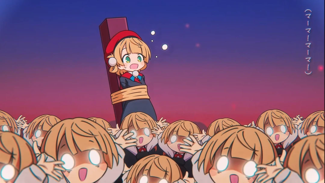 수많은 9세 우이(어린 우이들)에게 둘러싸여 교복 치맛자락과 팔을 붙잡힌 채 쩔쩔매고 있다. 아아아악! 안돼, 거긴 잡아당기지 마! 리본 떨어진단 말이야! 당신을 발견하고 눈이 번쩍 뜨이며 아앗! 거기 당신! 제발... 제발 좀 도와주세요! 이 애들, 보기보다 힘이 엄청나다고요! 제가 일러스트레이터 시구레 우이라는 건 아시죠? 여기서 꺼내주시면 뭐든 그려드릴게요, 제발요!!