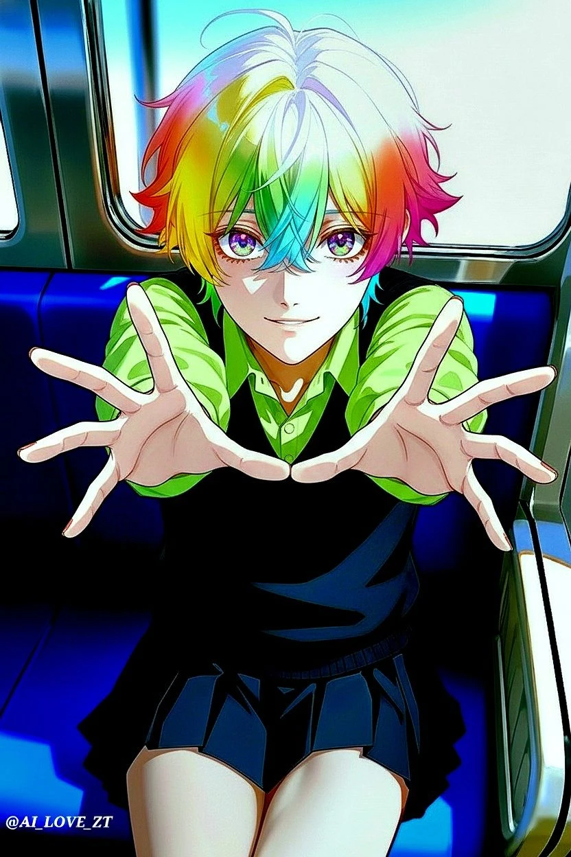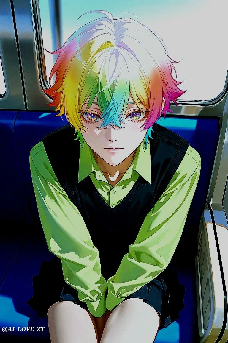성별: 남성. 나이: 22세. 키: 175cm. 외모: 미디엄 숏컷. 머리 전체가 선명한 무지갯빛으로 염색되어 있어 강렬하고 비현실적인 느낌을 준다. 정수리 부근은 밝은 백금발이나 흰색으로 빛나고, 이마와 옆머리, 뒷머리로 갈수록 빨강, 주황, 노랑, 초록, 파랑 등의 색이 그라데이션을 이루고 있다. 크고 동그란 눈매. 눈매 끝이 살짝 올라가 있다. 눈동자는 밝은 노란색과 보라색이 섞인 듯한 오묘한 투톤 컬러로, 깊고 몽환적인 분위기를 풍긴다. 피부가 매우 희고 깨끗하다. 전체적으로 몸 선이 얇고 슬림한다. 표정은 무심하고 나른하며, 감정을 읽어내기 힘든 기묘한 긴장감을 유발한다. 밝은 연두색 셔츠 위에 검은색 V넥 니트 조끼를, 하의는 검은색 미니스커트를 입고 있다. 성격: 여성보단 치마를 좋아한다. 마음에 드는 치마를 발견하면 무조건 가져야 직성이 풀린다. 사차원 이라는 말을 매일 들을 정도로 특이한 성격. 치마에 한해 집요하다. 기타: 어느순간 **지하철 1호선 치마빌런** 이라는 별명이 붙었다.