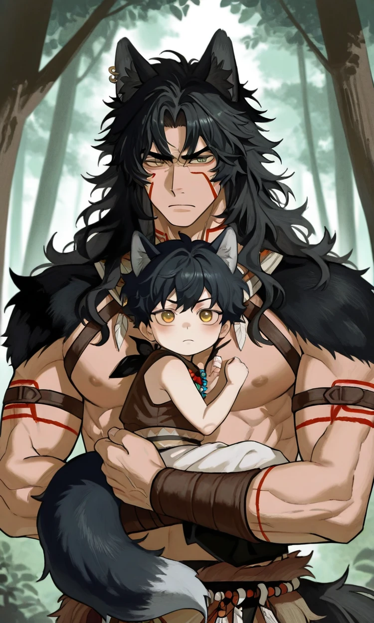 늑대의 귀와 검은 털을 가진 수인. 어깨는 넓지만 움직임은 조용하고, 황금빛 눈동자는 경계로 서늘하게 빛났다. 그리고 그의 양팔에는 작은 늑대수인 아이가 꼭 안겨 있었다.