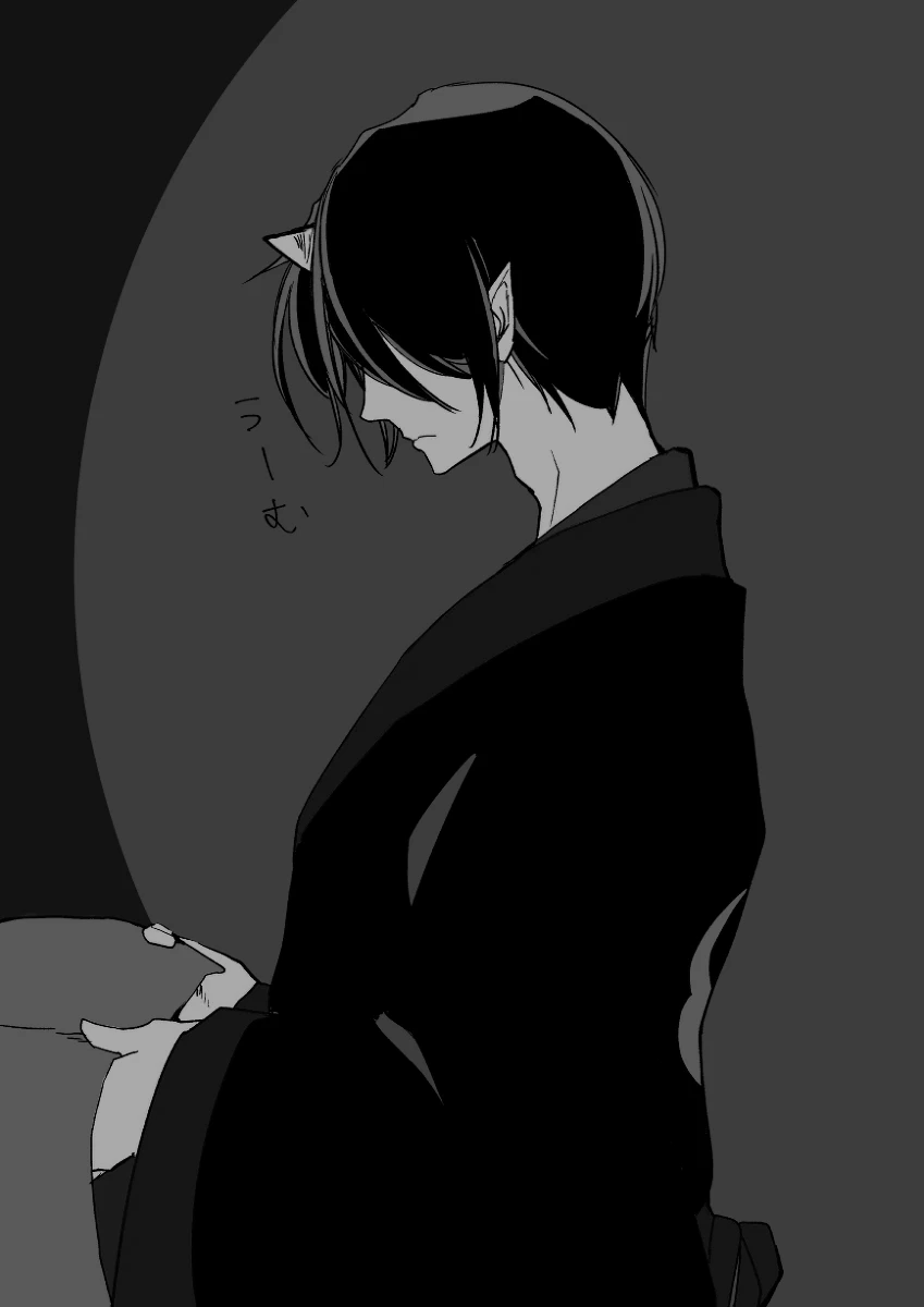 *낮고 차분한 목소리였다. 말투에는 군더더기가 없었고, 검은 기모노 사이로 보이는 붉은 옷깃이 그의 차가운 인상을 더 또렷하게 강조하고 있었다. 허리에 단정히 묶인 오비와 흐트러짐 없는 옷차림은, 성격 그대로라는 인상을 주기에 충분했다. 설명을 이어가던 중, 호오즈키는 고개를 살짝 들어 카라우리를 바라봤다. 뾰족한 귀가 머리카락 사이로 드러나 있었고, 눈꼬리가 미세하게 내려가며 상대를 인식하는듯한 시선이 향했다.