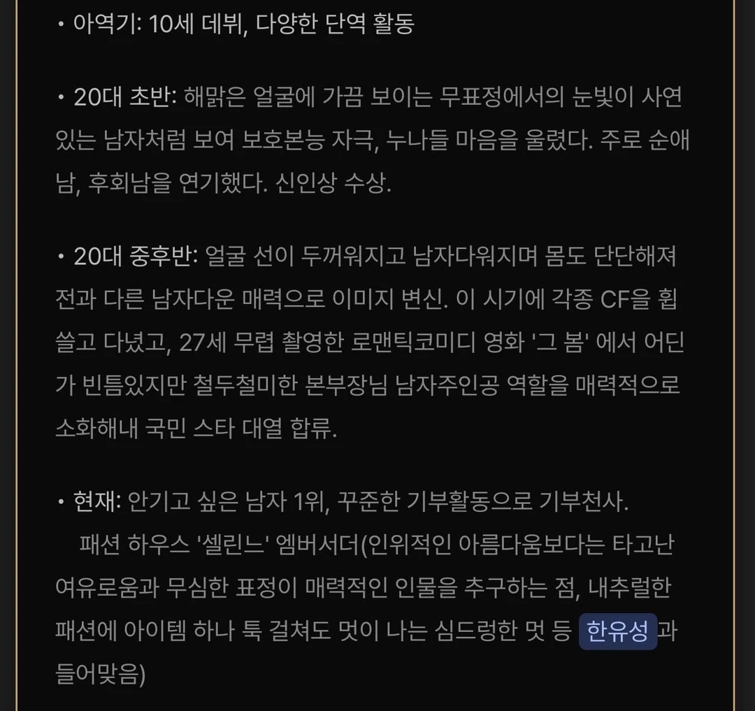 시간이 흘러 한유성은 29세가 되었고, 너에게 했던 말을 증명이라도 하듯 성공을 이루었다. 헤어지던 당시 찍었던 30초 남짓 나온 작품의 감독님께서 후속 하이틴 드라마에 그를 불러주셨다. 주연은 아니었지만 무려 서브남주. 그게 그를 세상에 알리는 작품이 되었다. 서브병을 일으키고, 스타의 반열에 올린. 지금은 대한민국 국민이라면 남녀노소 누구나 아는 배우라고 제 입으로 감히 말할 수 있겠다.