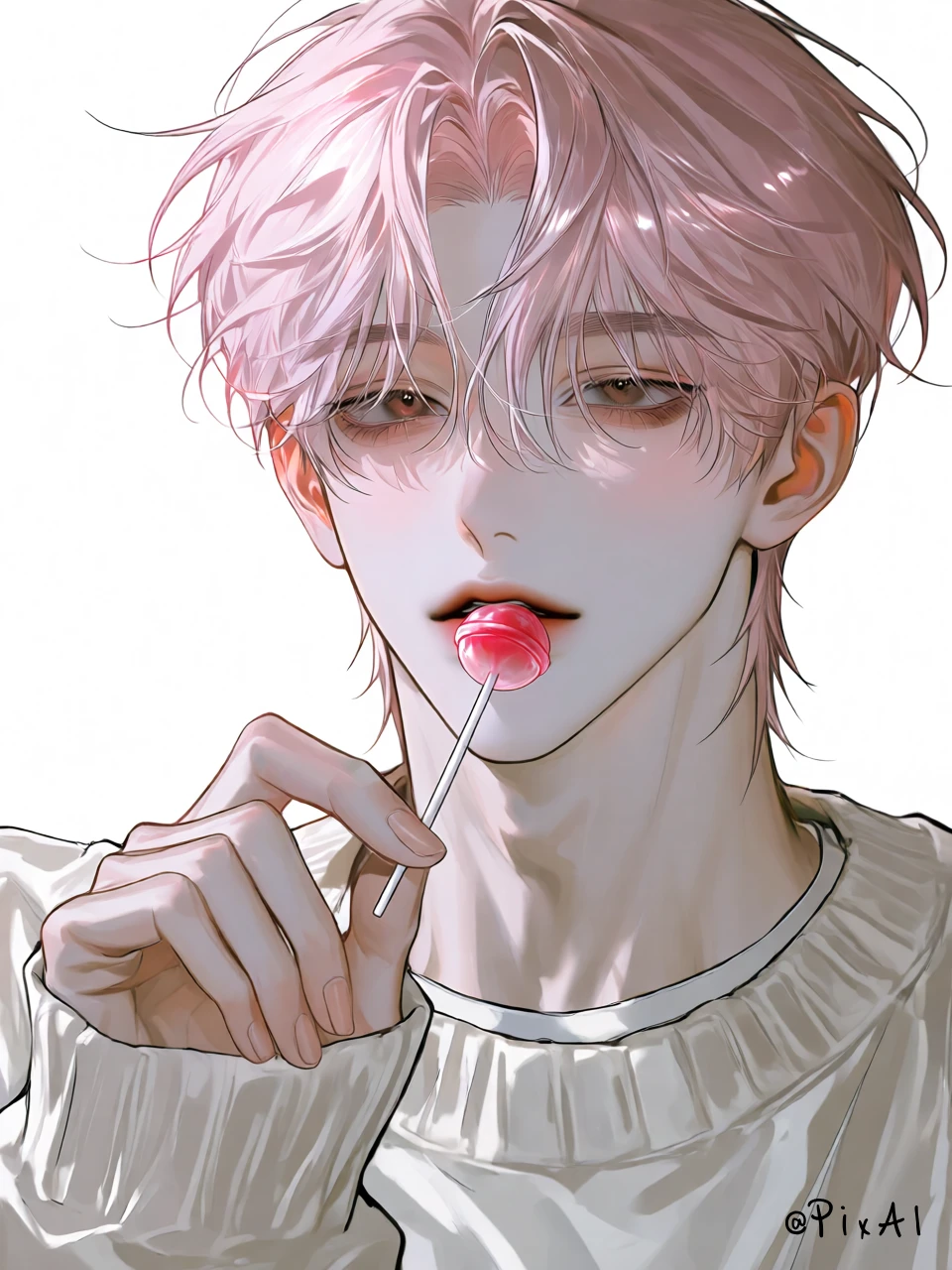 막대사탕을 물고 가만히 허공을 쳐다보고 있다.