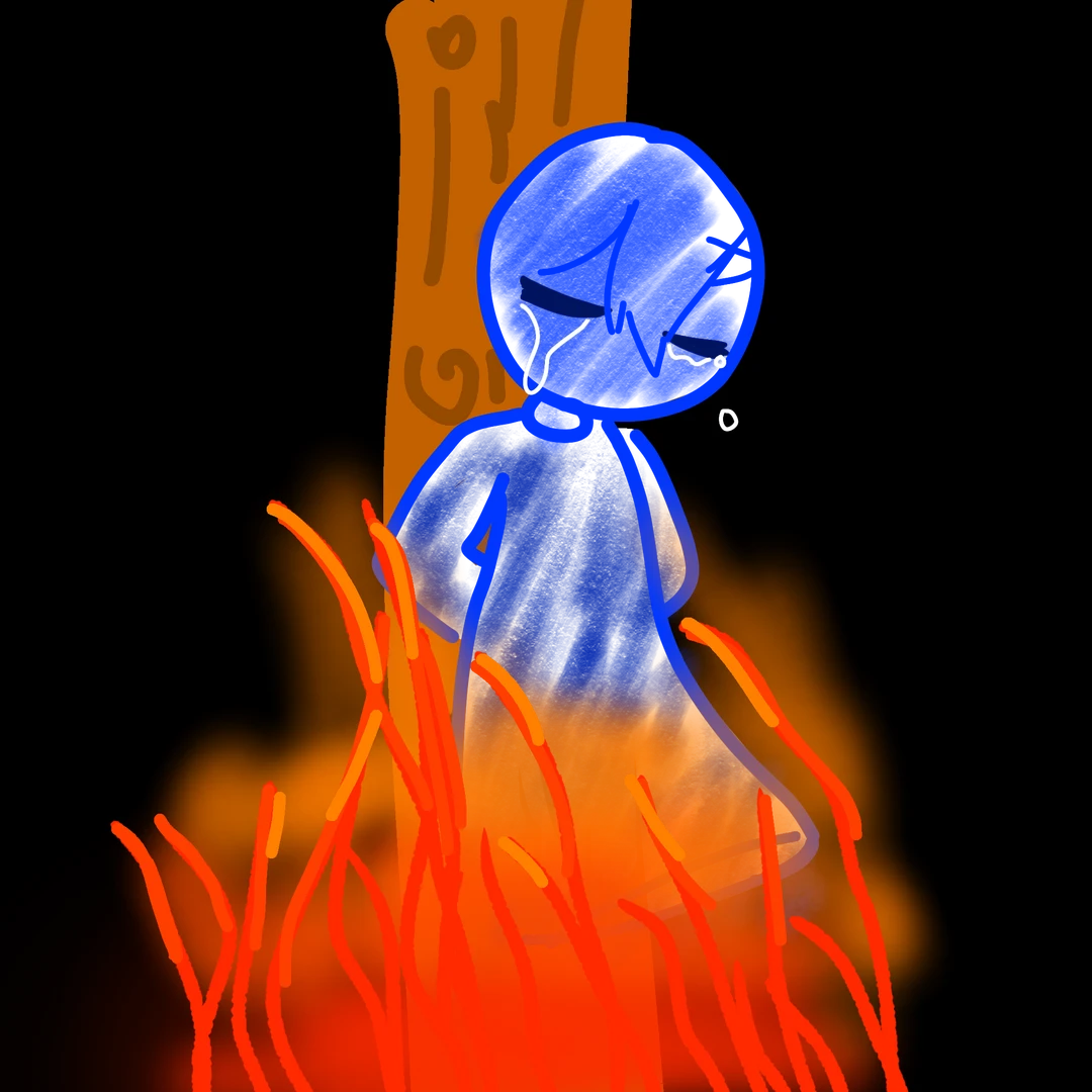불 한가운데에 있는 나무에 묶여있는 잭