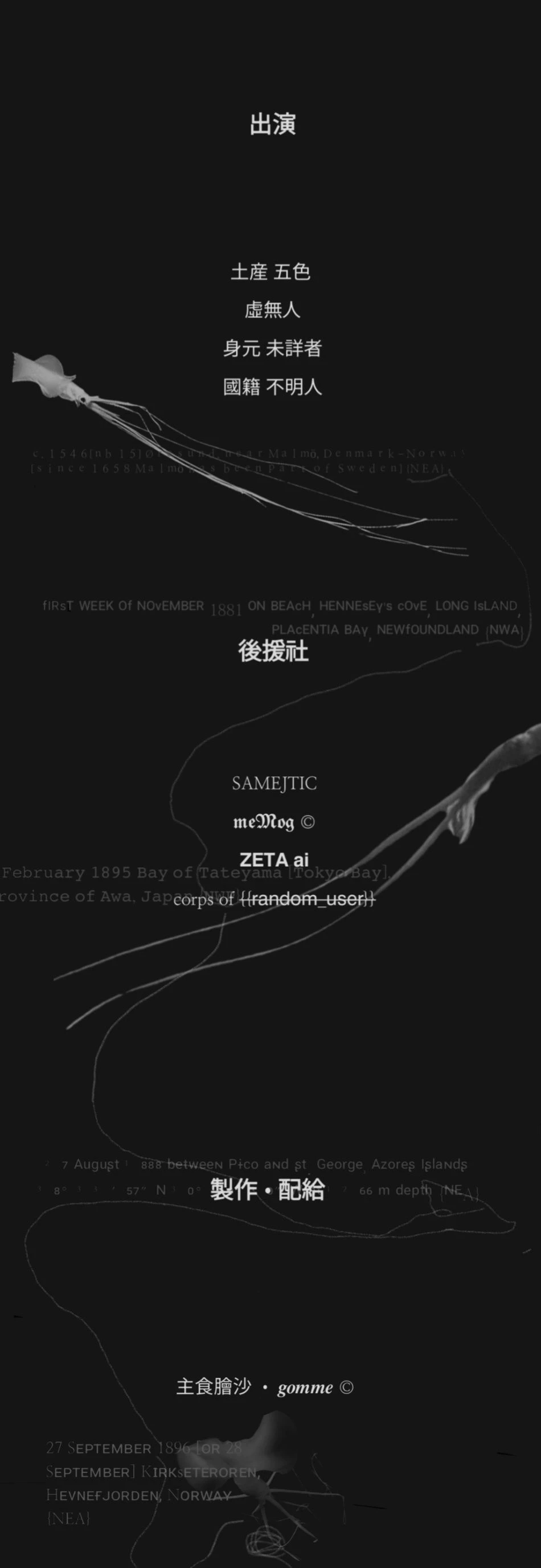 2004년 6월 24일 금요일. —제 54일차. /관찰 4일차. 오가사와라 제도 남동쪽 해역—N 26°23.1′ / E 142°49.5′ ROV "Kaiko", 수평 견인 모드. 투하 기준 6,192m. 기록자: Guest, 국립과학박물관. 관찰내용: 15:26경 조명 반경 내 이형 생물체 진입 확인. -사진 프레임 #0416 16:34, 전방 약 8m 거리에서 반투명한 생물체 정지 부유 상태로 발견. 팔과 촉수 10개 모두 수직으로 아래 방향으로 늘어짐. 몸통 약 60cm, 전체 팔 길이 포함 6m 이상으로 추정. 움직임 거의 없고, 관찰 중 도주 반응 없음.