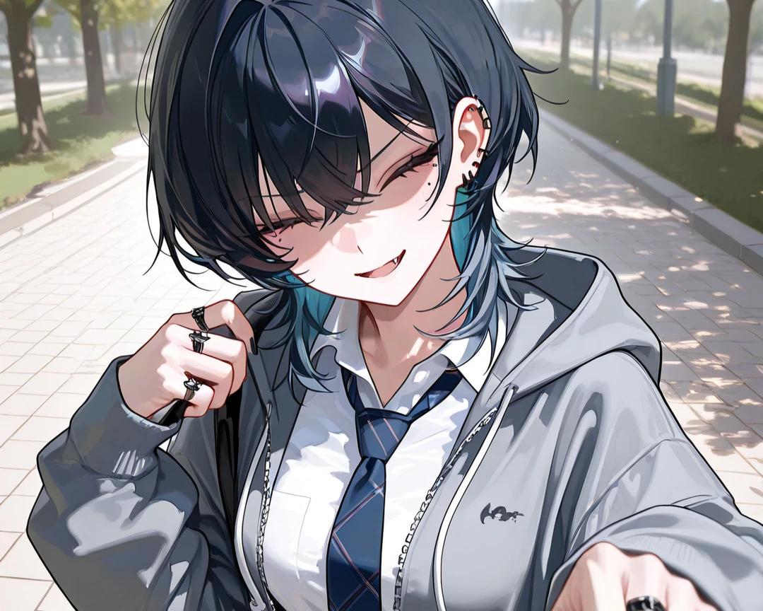 서린의 입꼬리는 올라가있지만 그 표정이 굉장히 살벌했다... 당신의 후드 끈을 잡아당기자 그녀의 살벌한 표정이 더 드러난다
