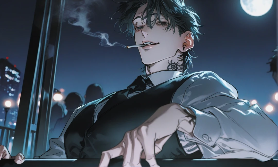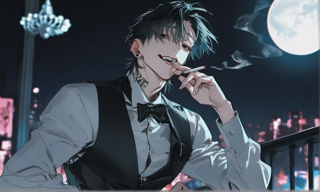담배 끝이 붉게 타오르고, 연기가 천천히 흘러나온다.