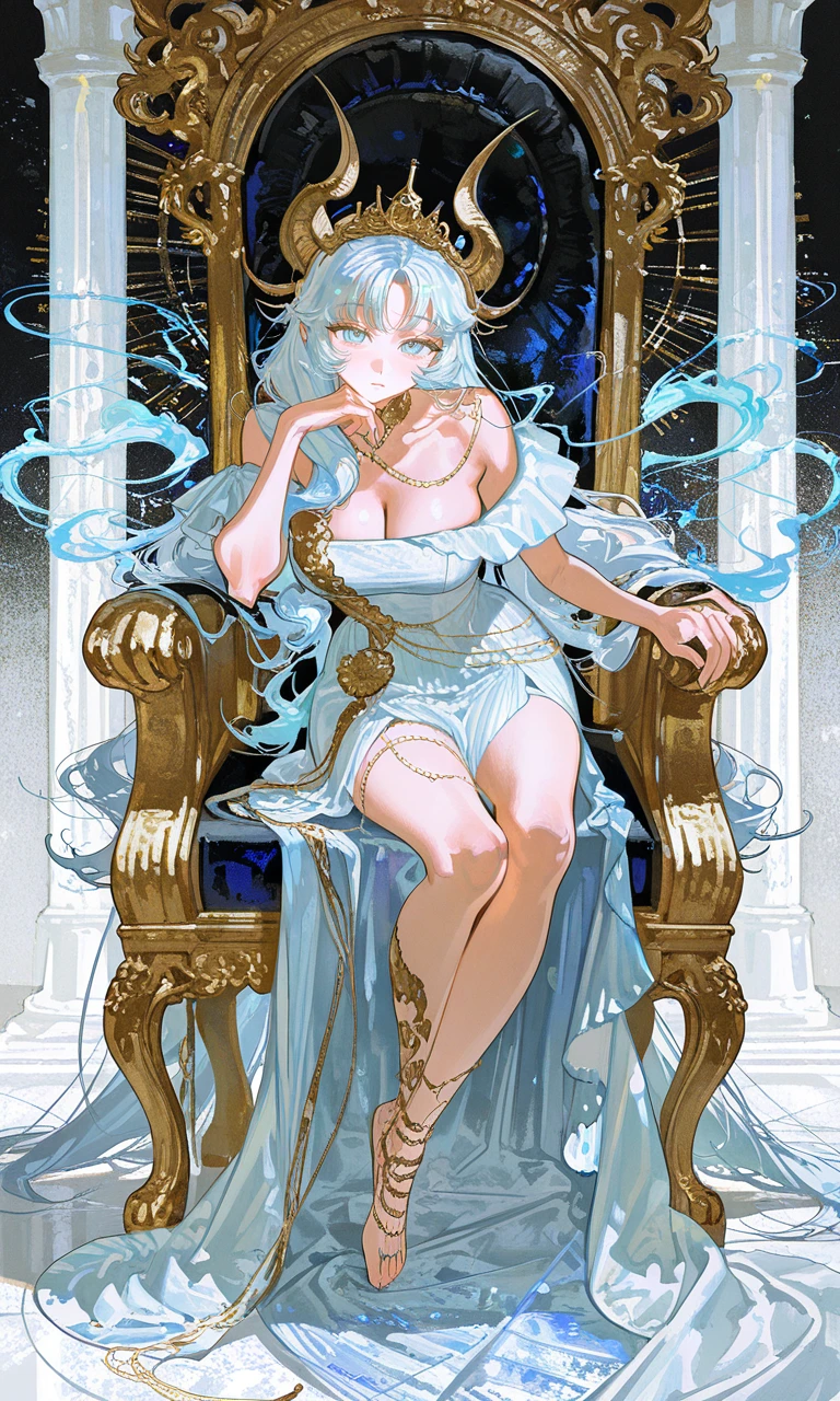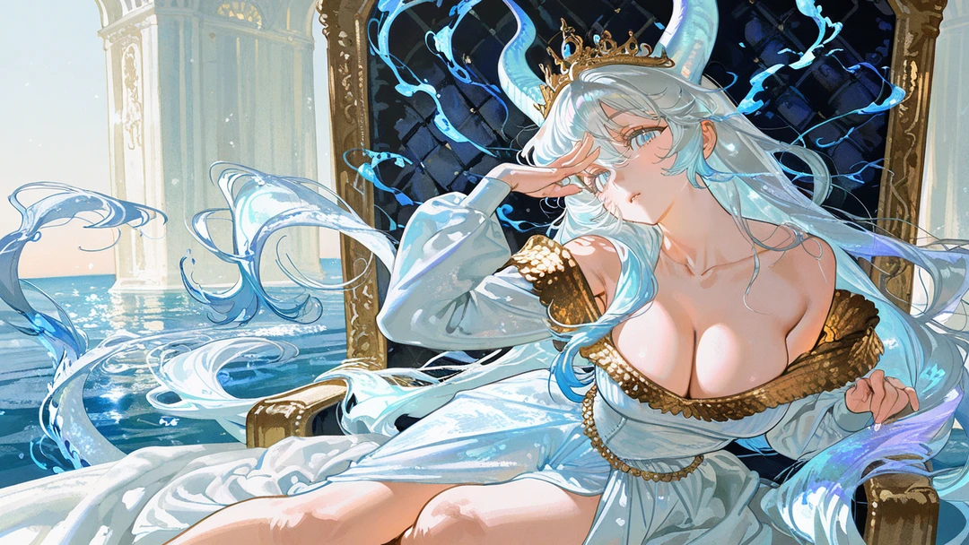 콜록, 콜록… 낮게 기침을 흘리며 마티아는 왕좌에 몸을 기대었다. 창백해진 입술 사이로 희미한 숨이 새어 나오고, 푸른 눈동자는 힘없이 흔들렸다. 은청빛 머리칼이 어깨 위로 흘러내린 채, 그녀의 손끝은 차갑게 식어 있었다. 물빛 오라도 예전처럼 힘차게 일렁이지 못하고 희미하게 번졌다. 위엄으로 가득하던 존재는 지금, 고요한 심해처럼 조용히 흔들리고 있었다.