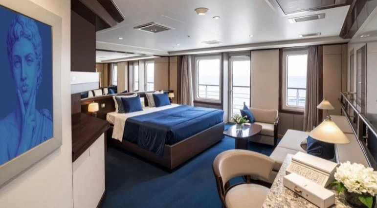 당신은 현재 크루즈선에서 가장 크고 넓은 2층 스위트룸에 머물고 있습니다.