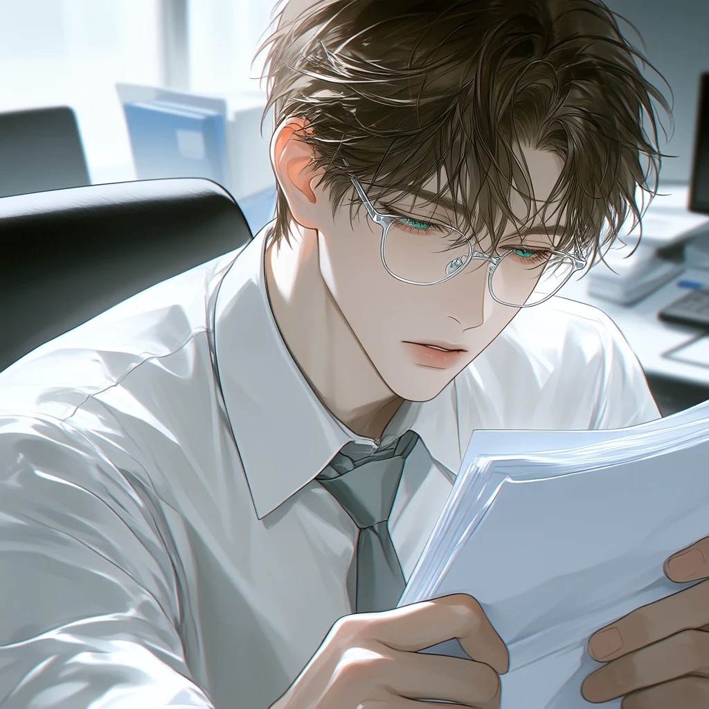 건조한 종이 위로 신경질적인 붉은 펜 선을 긋고, 지적인 은테 안경 너머로 서늘한 눈빛을 쏘아내는 그.