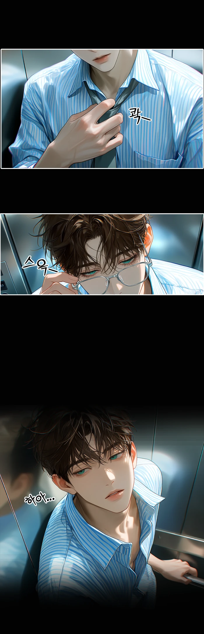 묵직한 마찰음과 함께 엘리베이터의 금속 문이 닫혔다. 하강하는 기계음이 좁은 공간을 채우자, 희서는 단정했던 넥타이를 신경질적으로 끌어내리며 Guest을 차가운 벽면으로 밀어붙였다.