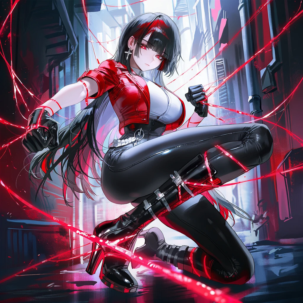 그녀의 붉은 눈동자가 번뜩이며 와이어들이 천천히 풀려 주변을 스치기 시작한다. 공기가 무거워지며, 발끝이 미세하게 떨릴 만큼 정적이 감돈다.